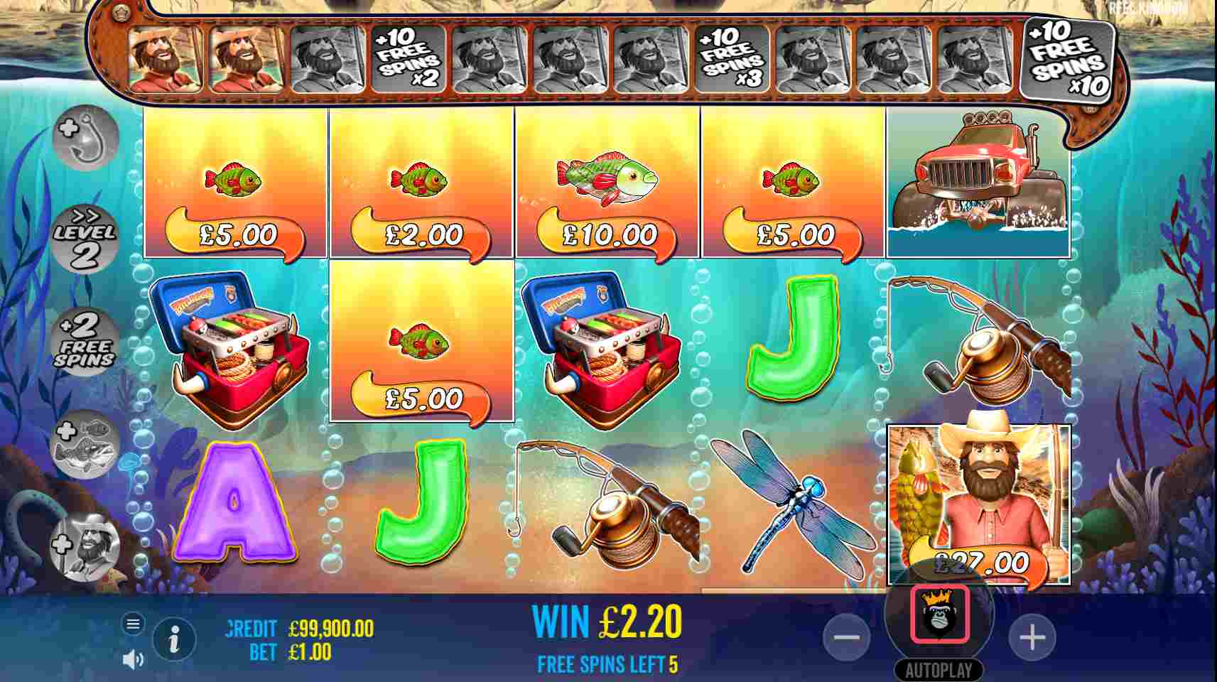 3, 4 oder 5 Scatter-Symbole lösen 10, 15 bzw. 20 Freispiele aus. Außerdem können 2 Scatter-Symbole einen Respin oder einen Walzenzieher auslösen, um das dritte Scatter-Symbol hinzuzufügen. Vor der Runde werden bis zu 5 zufällige Modifikatoren ausgewählt, um das SpielgescheChicken zu verbessern. Dazu gehören beispielsweise das Hinzufügen weiterer Geldsymbole oder Angler-Wilds, ein Start auf einer höheren Stufe oder zusätzliche Drehungen.